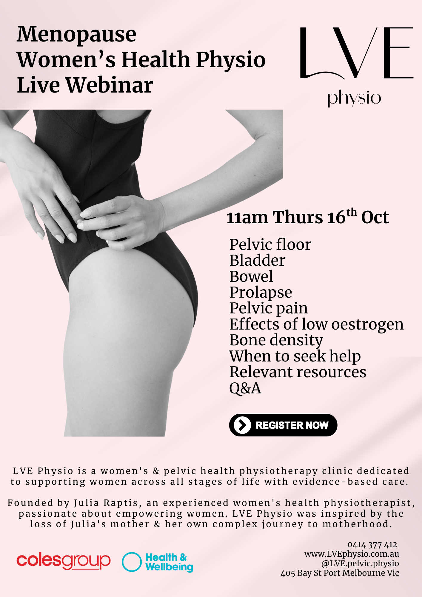 This session is designed to help you better understand your body, feel confident in caring for your health, and know when it may be helpful to see a Women’s Health Physiotherapist.